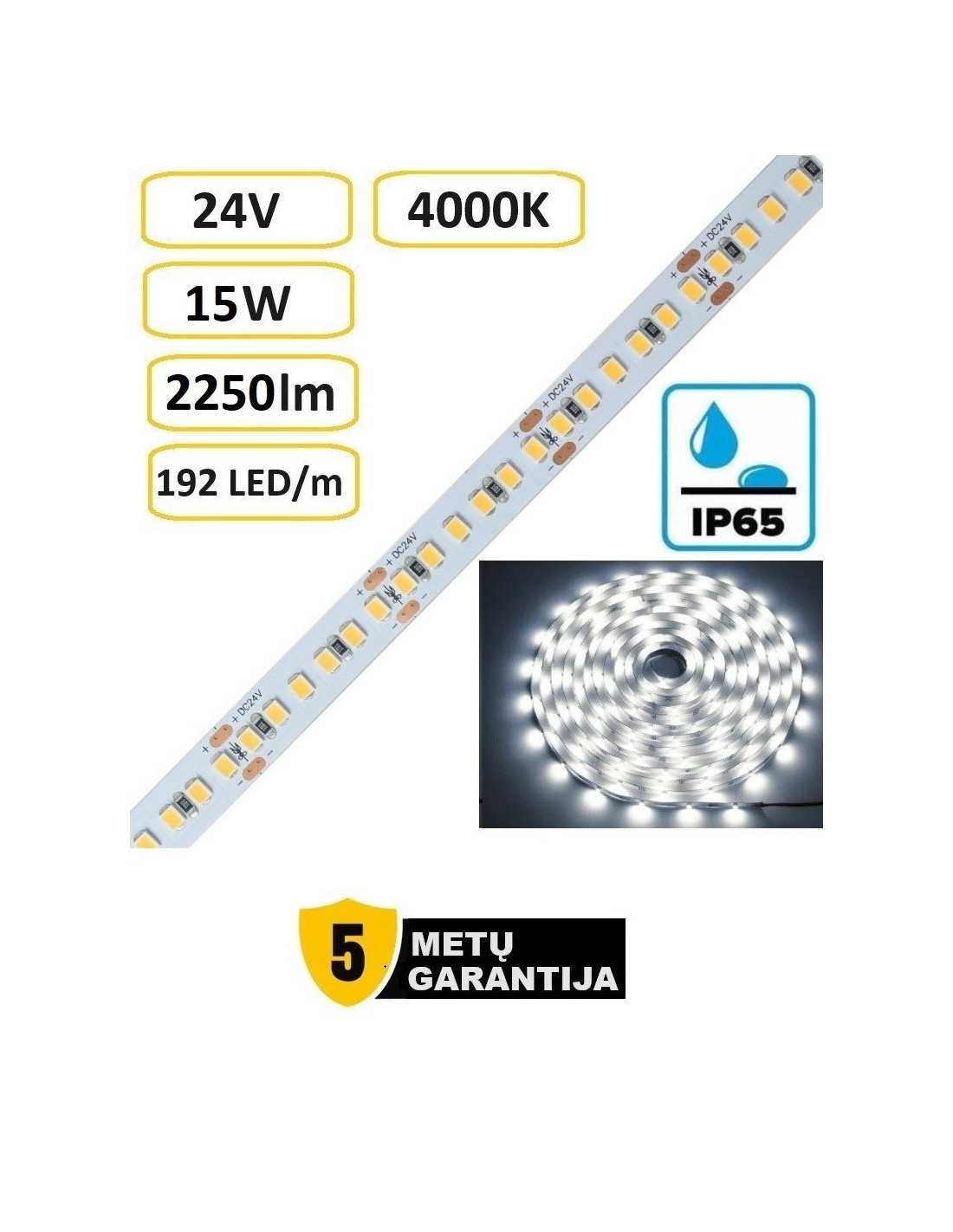 LED juosta - 24V - 15W - 2250lm - 4000K - IP65 - 192LED - 5 metų garantija