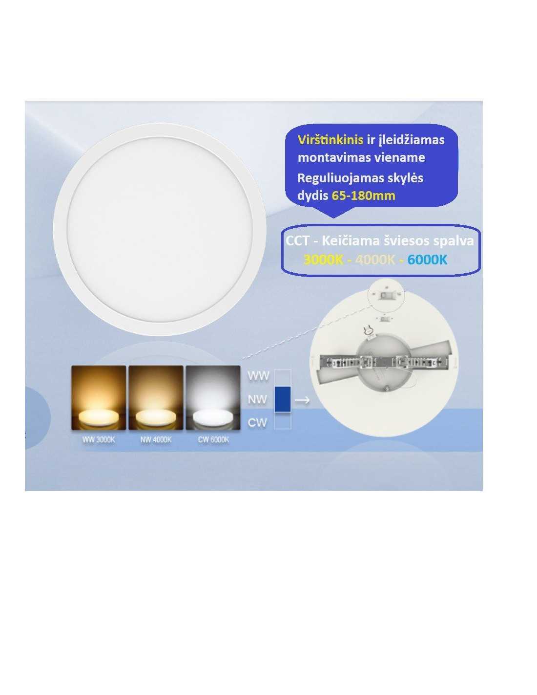 Įleidžiama ir virštinkinė LED panelė - 24W - 2600lm - CCT