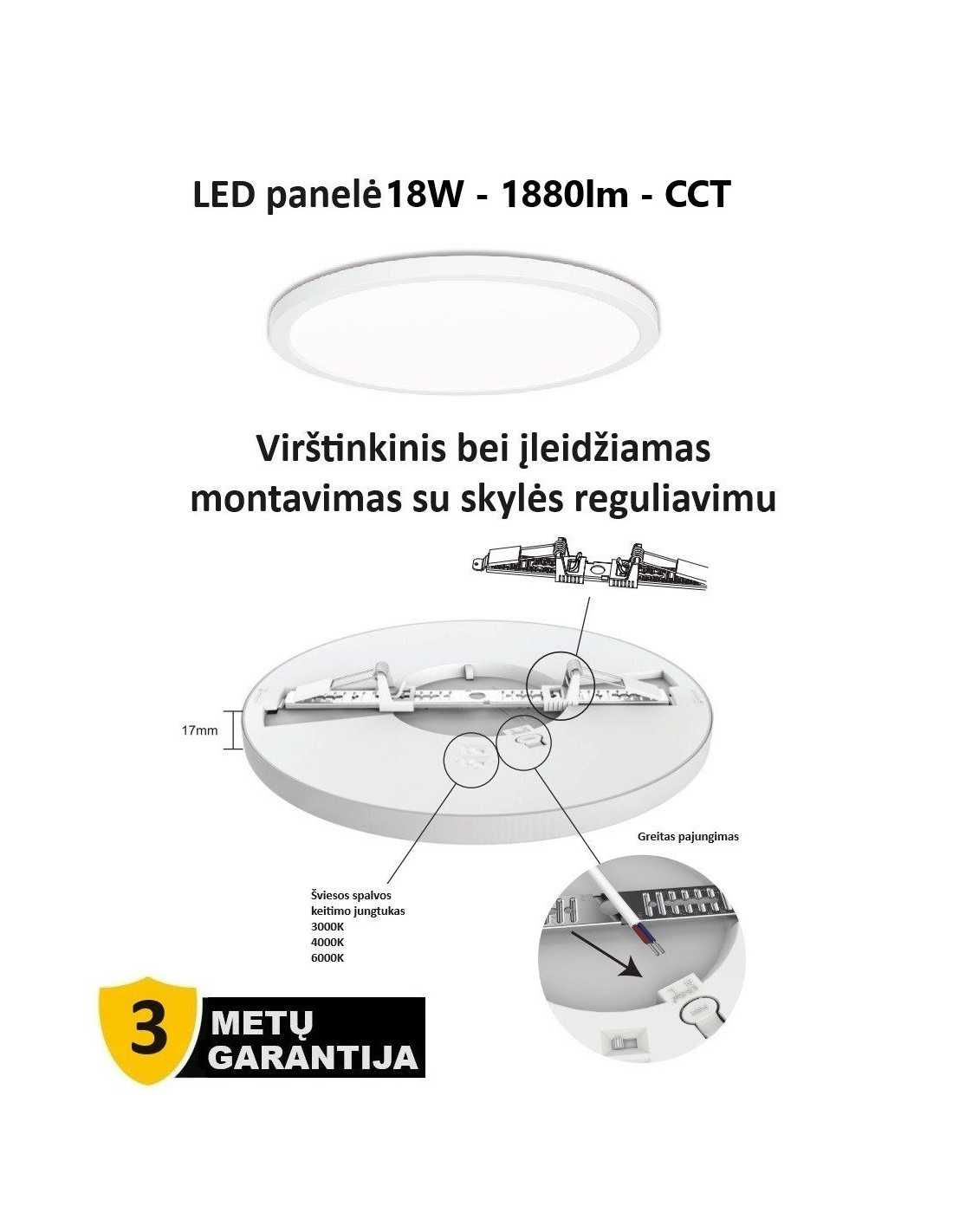 Įleidžiama ir virštinkinė LED panelė 18W – tai praktiškas ir stilingas sprendimas tiek namams, tiek biurui. Šis lubų šviestuvas pasižymi aukštu šviesos srautu – 1880 lm, todėl užtikrina ryškų ir tolygų apšvietimą. Didžiausias privalumas – reguliuojama šviesos spalva (CCT): galite pasirinkti šiltą 3000K, neutralią 4000K arba šaltą 6000K spalvą pagal poreikį.
